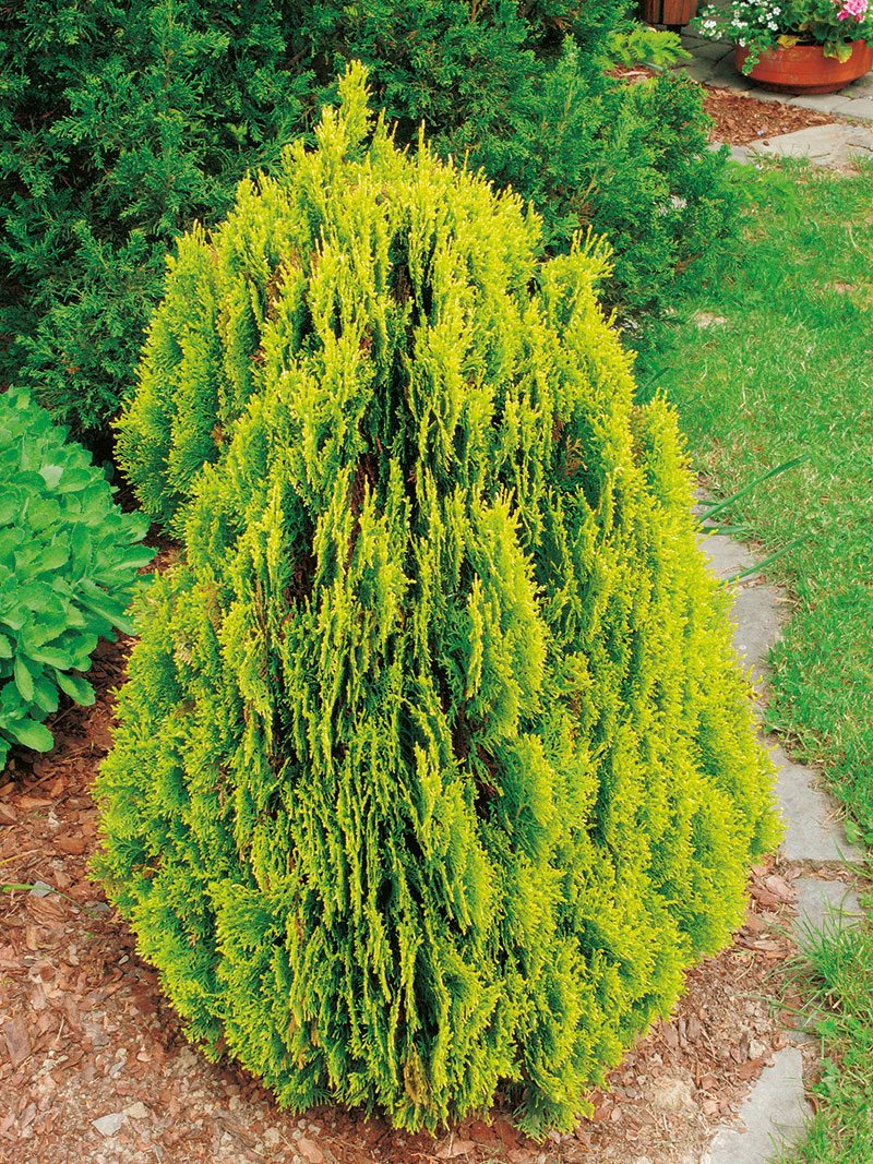 En vakker, eggformet og saktevoksende varietet, kan bli opptil ca. 1,2 meter høy etter 10 år. Har tette, delikate, gyllengule skudd. Planten har små krav til jorden og fuktigheten, men bør være skygget for vinden. Anbefales til små hager og fjellhager.